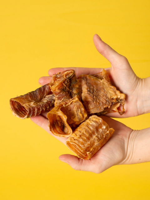 Cada pacote contém 5 pedacinhos de traqueia bovina desidratada.
